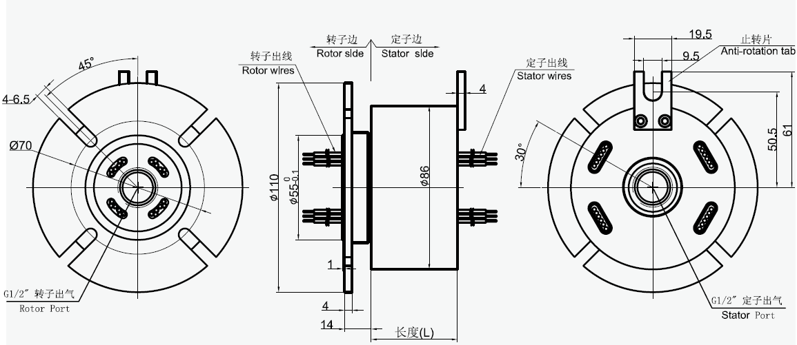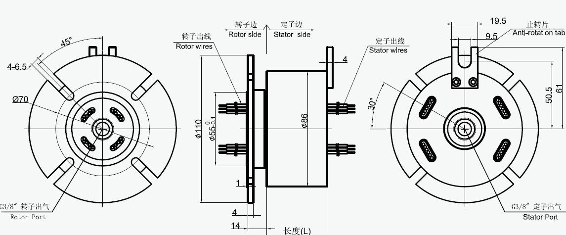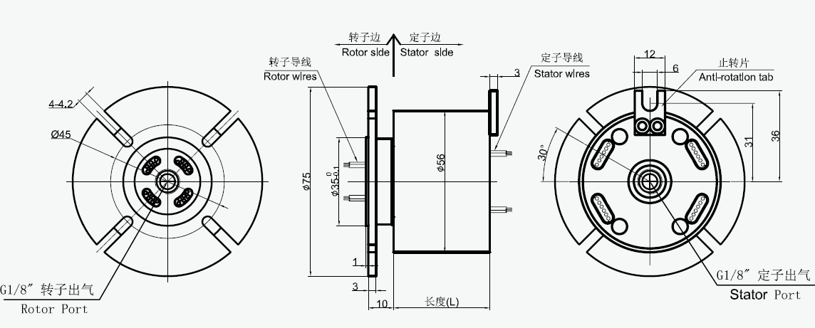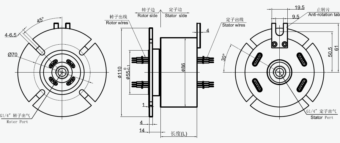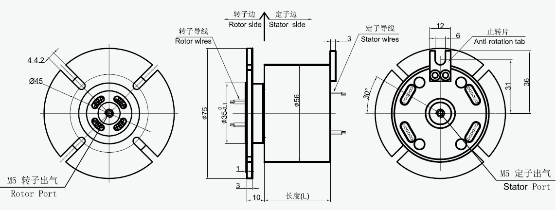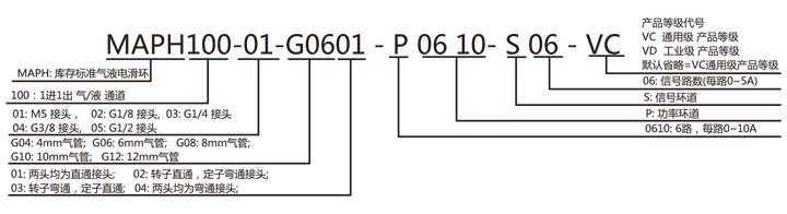 MAPH100-01, MAPH100-02氣液電一體滑環(huán)選型表 1)XX=01 接口尺寸M5 2)XX=02 接口尺寸G1/8 |