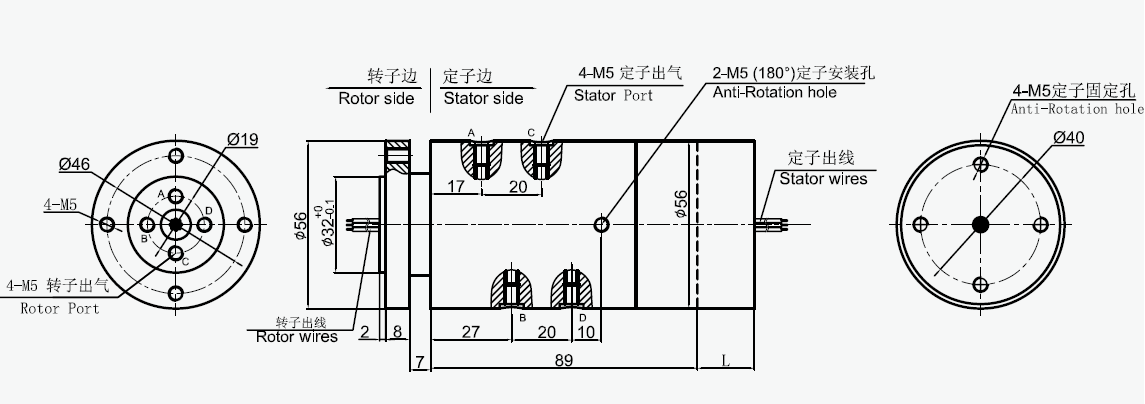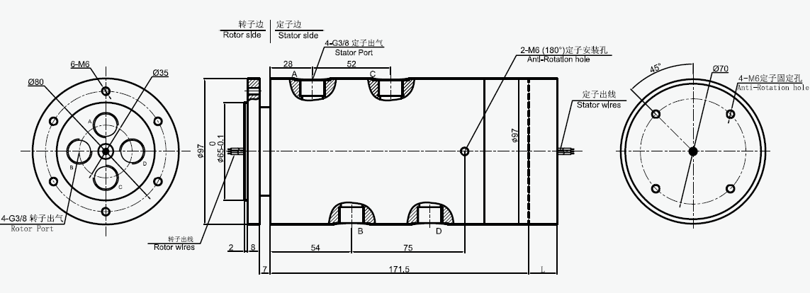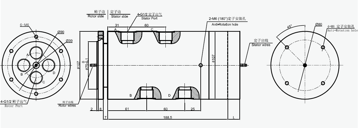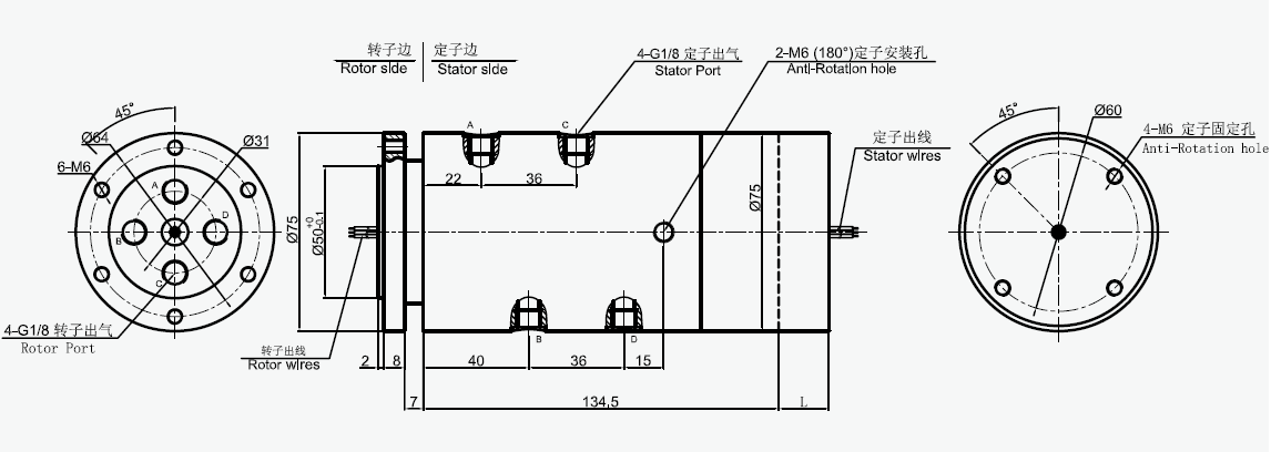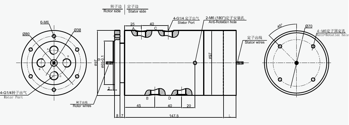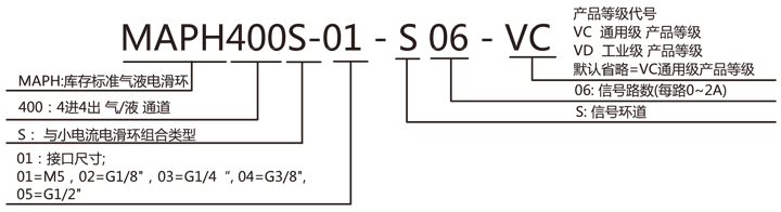 MAPH400S-XX 氣液電一體滑環(huán)選型表 1)XX=01,接口尺寸=M5, 氣管規(guī)格3~6mm 2)XX=02,接口尺寸=G1/8,氣管規(guī)格3~10mm 3)XX=03,接口尺寸=G1/4,氣管規(guī)格3~12mm 4)XX=04,接口尺寸=G3/8,氣管規(guī)格3~16mm 5)XX=05,接口尺寸=G1/2,氣管規(guī)格3~20mm |