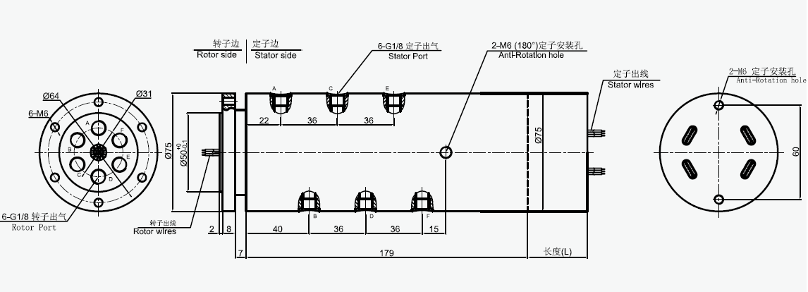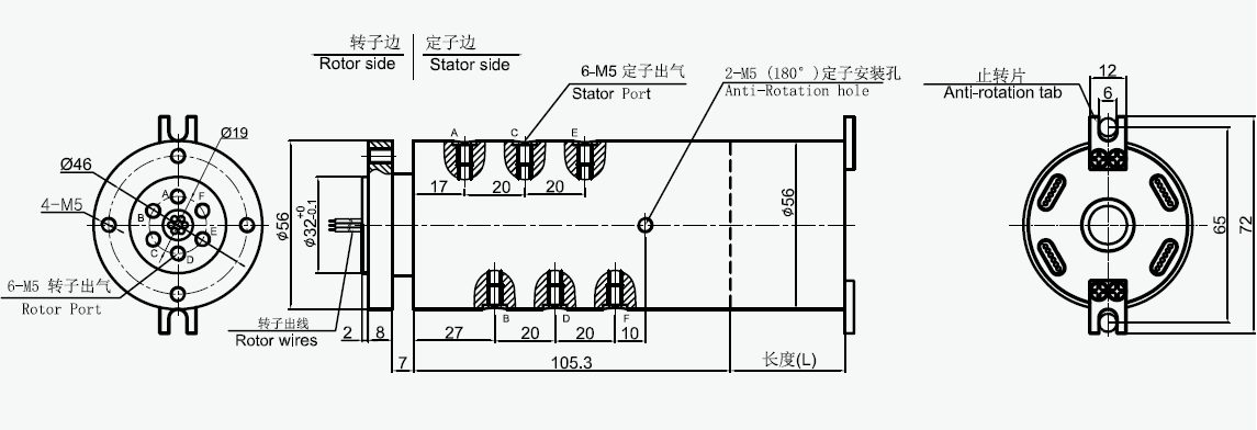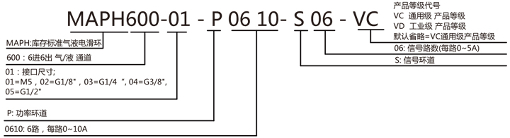 MAPH600-XX 氣液電一體滑環(huán)選型表 1)XX=01,接口尺寸=M5, 氣管規(guī)格3~6mm 2)XX=02,接口尺寸=G1/8,氣管規(guī)格3~10mm 3)XX=03,接口尺寸=G1/4,氣管規(guī)格3~12mm |