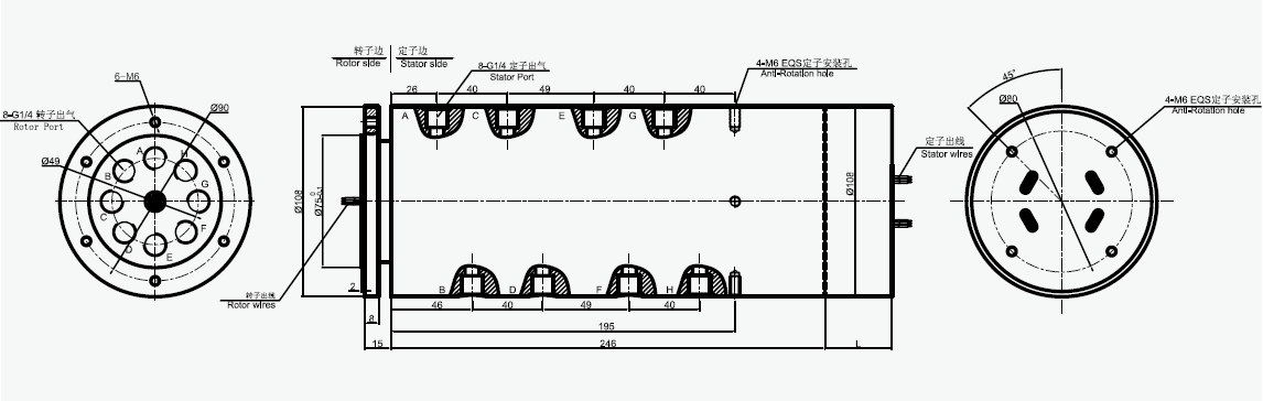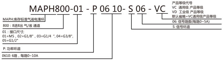 MAPH800-XX 氣液電一體滑環(huán)選型表 1)XX=01,接口尺寸=M5, 氣管規(guī)格3~6mm 2)XX=02,接口尺寸=G1/8,氣管規(guī)格3~10mm 3)XX=03,接口尺寸=G1/4,氣管規(guī)格3~12mm |