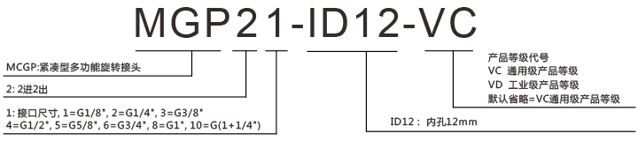 | MGP21 | 2進2出 | G1/8" | N/A | 0-50MPa | MGP23-ID19 | 2進2出 | G3/8" | 19mm | 0-50MPa |