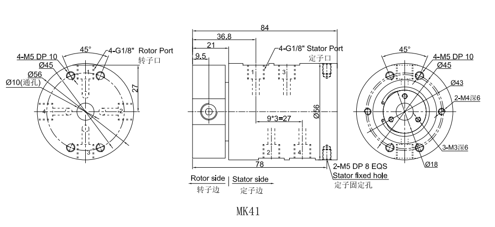 | MK41(純氣動旋轉(zhuǎn)接頭)尺寸圖 4進4出G1/8"牙 | |||